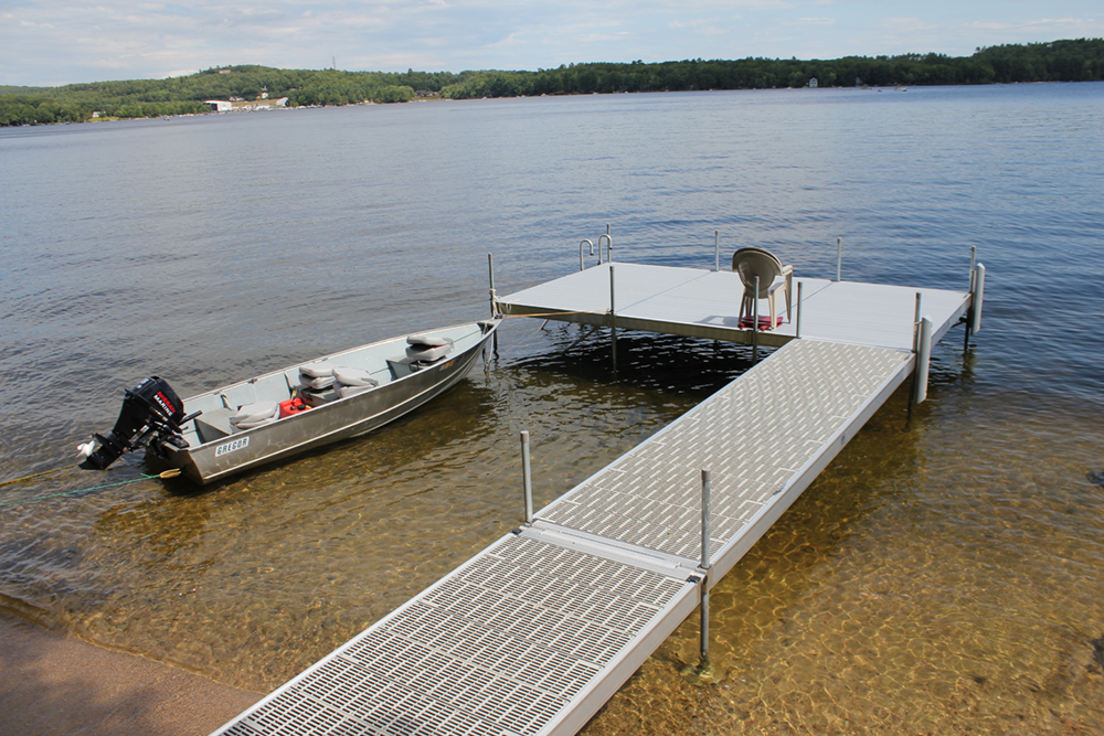 Robust Components:(2) 4 ft. x 8 ft. Assembled Aluminum Docks / Multiple corrosion-resistant dock pipes (4, and 6 ft. options) / Heavy-duty brackets and footpads in gray powder coat / White PVC Vinyl safety caps